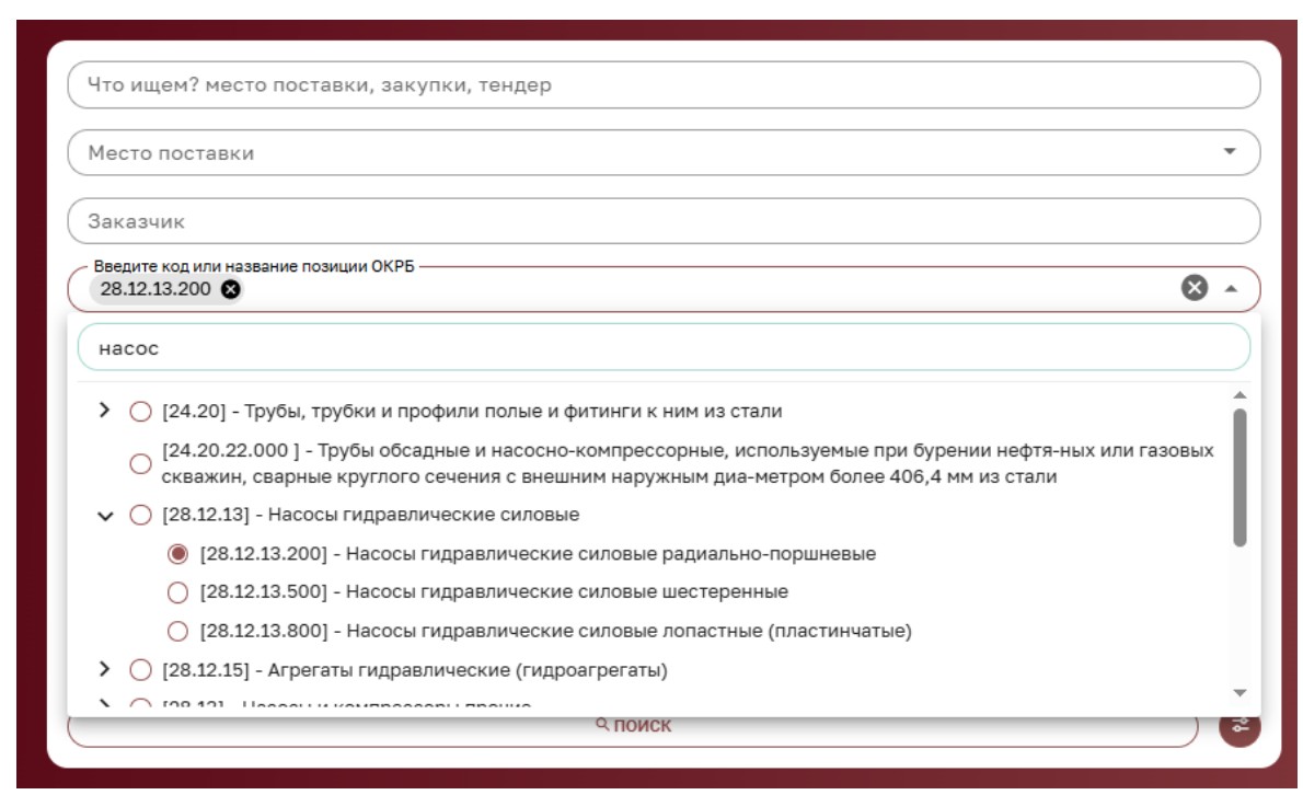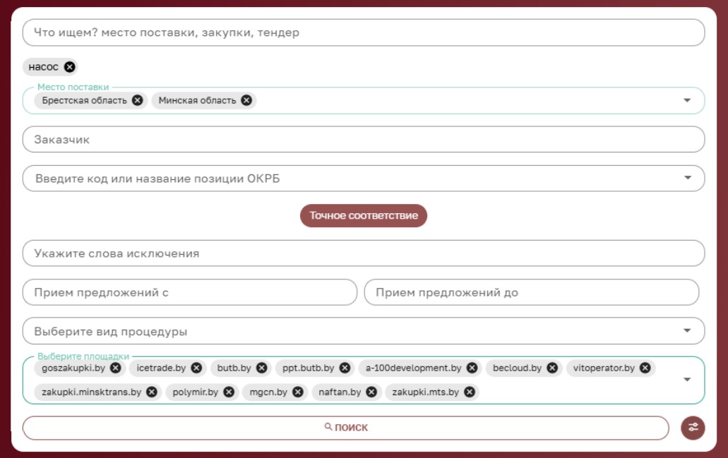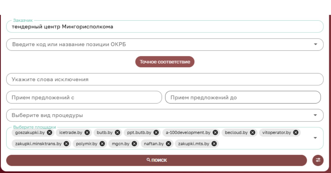 Гибкость под разные сценарии участия. Можно искать как по номенклатуре (ключевые слова, ОКРБ), так и точечно по заказчику или по выбранным площадкам — в зависимости от того, как устроена ваша работа с закупками.