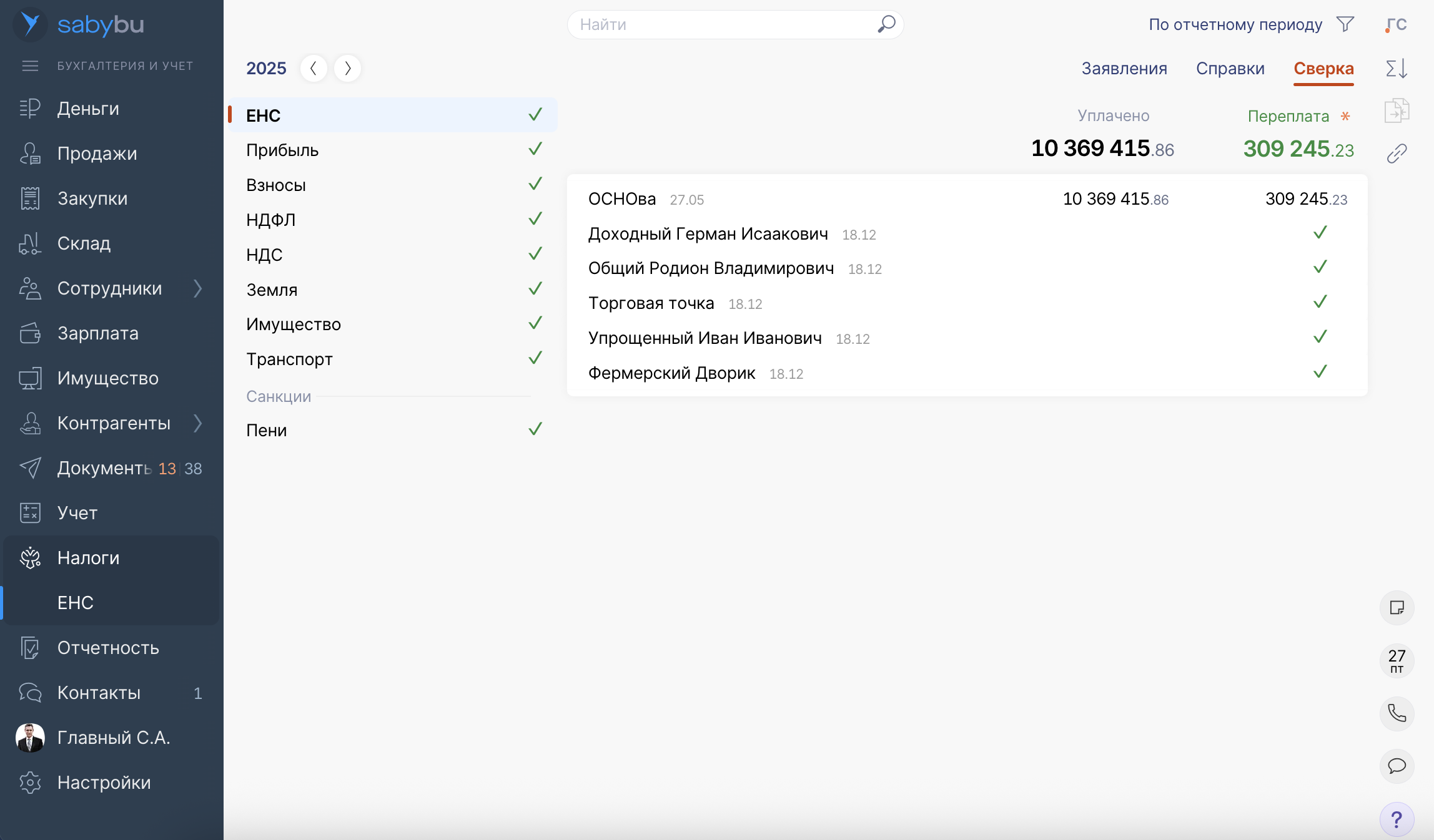 - Налоги и сверка с ЕНС. Облачная бухгалтерия Saby Bu рассчитывает налоги по действующему законодательству для всех режимов, помогает сверить движения и остатки на Едином налоговом счете с учетными данными, подсвечивает расхождения и подсказывает, как их устранить. Статусы всех отправок и уведомлений доступны в один клик.