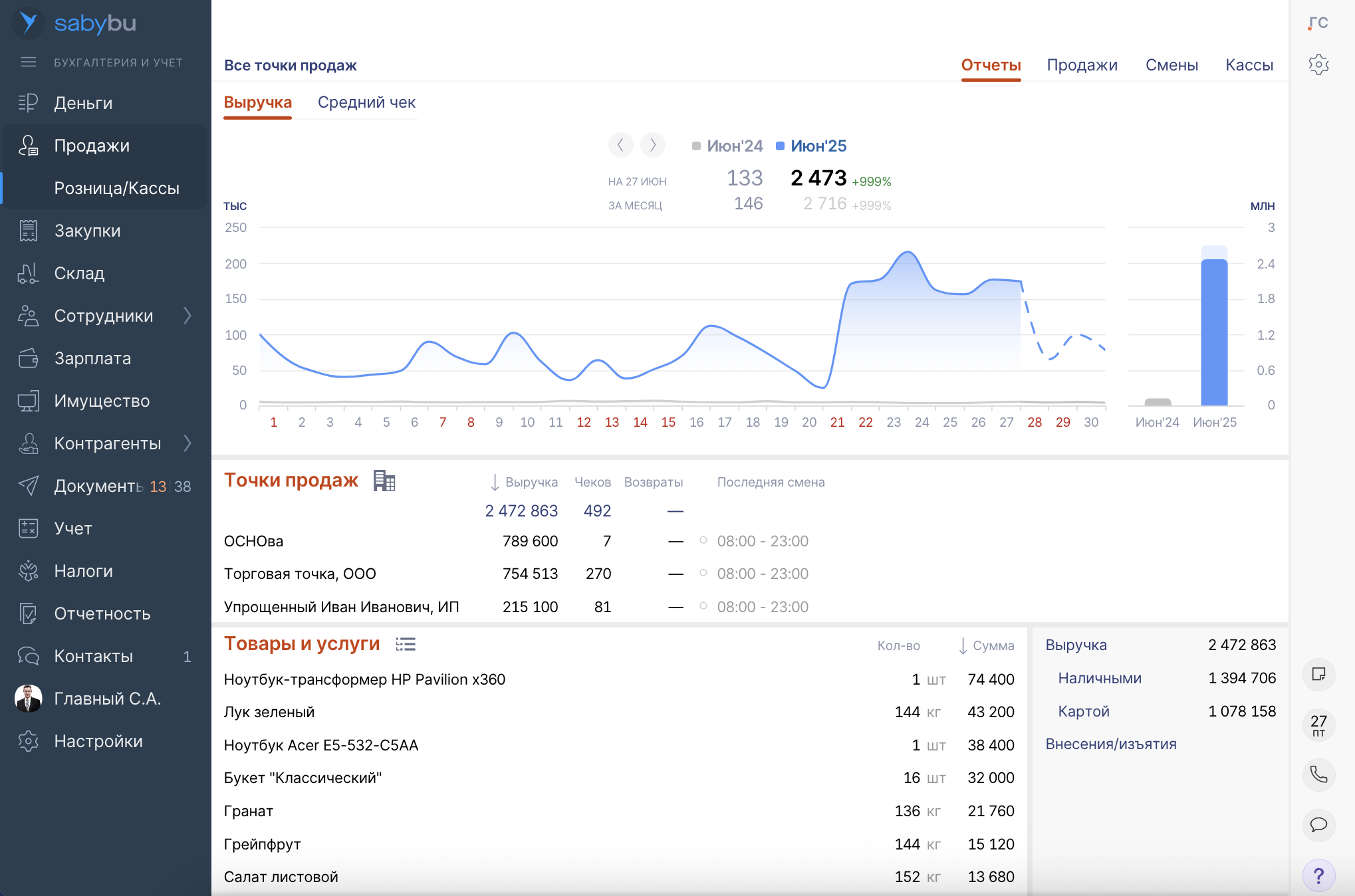 - Интеграции с банками и кассами. Платформа подключается к расчетным счетам и ККТ, обеспечивая круглосуточный доступ к актуальным финансовым данным. Saby Bu учитывает все способы оплаты — наличные, безнал по счету, терминал, сайт, QR-код, а также выплаты по договорам комиссии маркетплейсов (Wildberries, Ozon, Яндекс Маркет, Авито и др.).