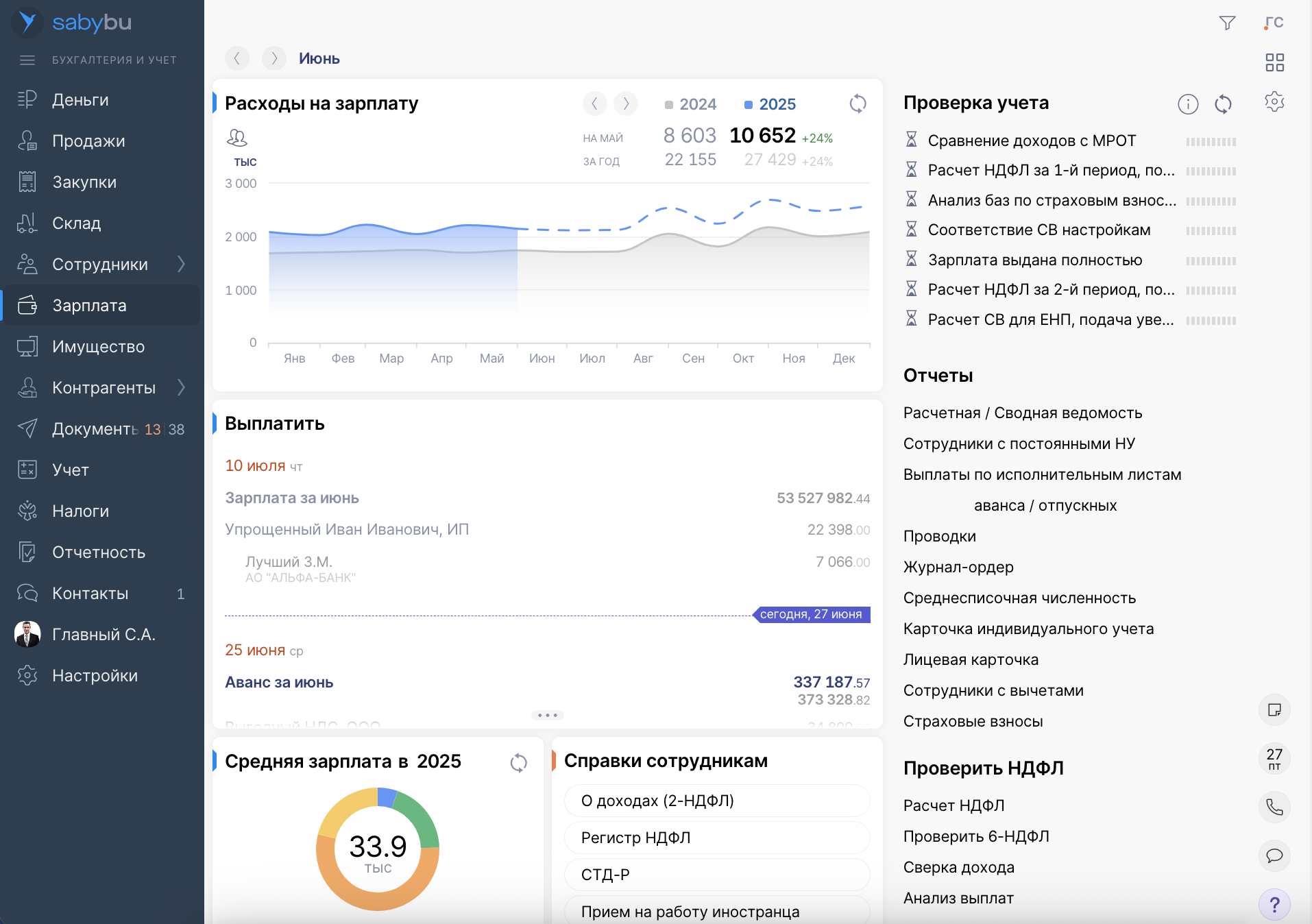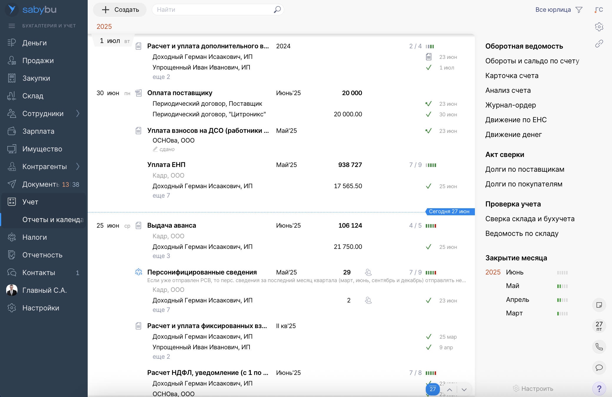 - Кадры и зарплата. Saby предлагает встроенный чек-лист для безошибочного оформления сотрудников. Зарплата рассчитывается с учетом отработанного времени, отпусков, больничных, всех начислений/удержаний и данных кадрового учета. Фискальные начисления выполняются автоматически — дальше можно сразу отправить или распечатать расчетные листки.