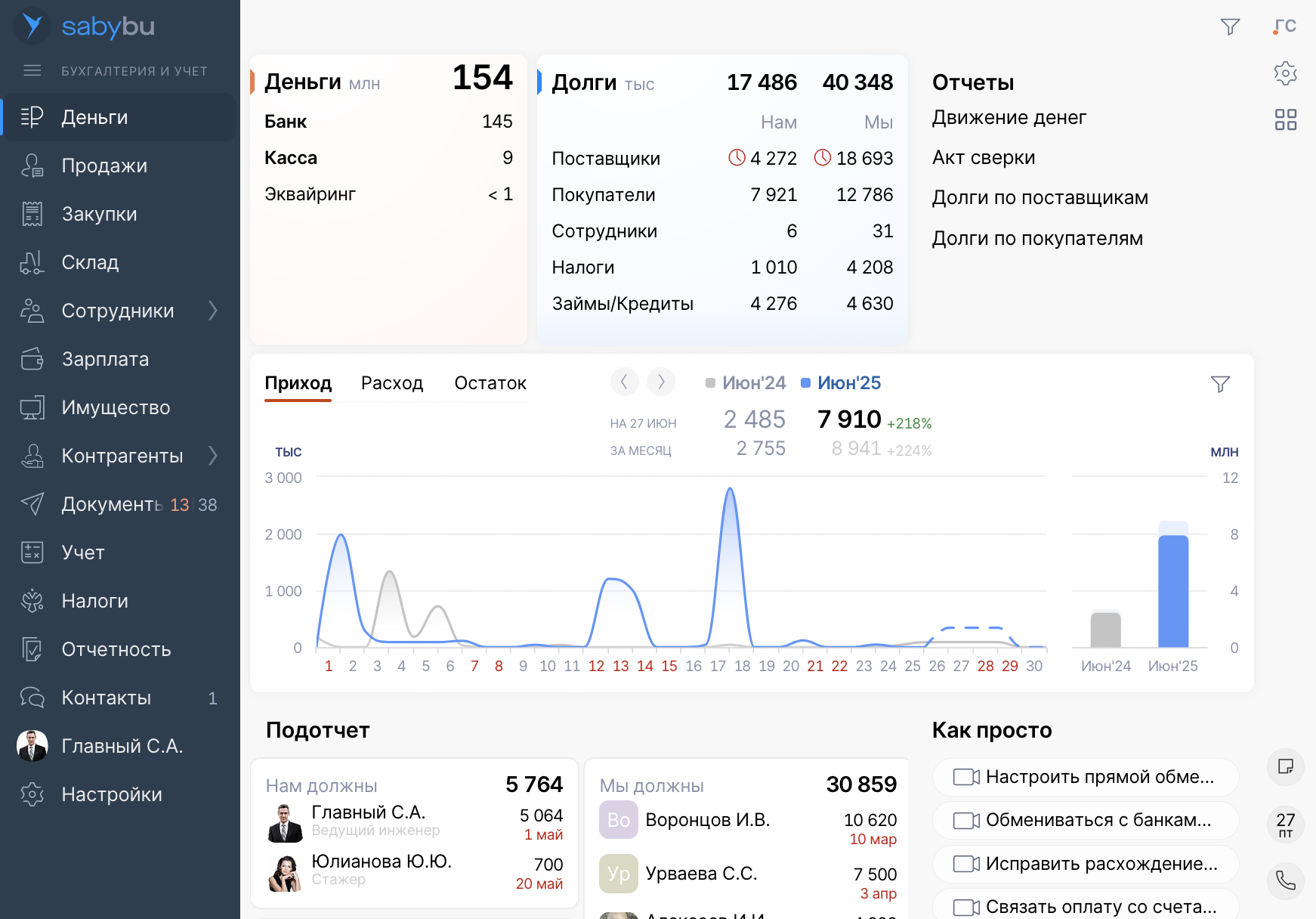 - Бухгалтерские отчеты и управленческий учет. Отслеживайте сальдо и обороты, проводите детальный анализ движений по каждому счету. В Saby Bu предусмотрен полный пакет стандартных форм: оборотно-сальдовая ведомость, обороты и сальдо по счету, анализ счета, карточка счета, журнал-ордер и другие отчеты для глубокого контроля.