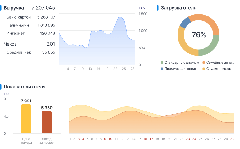 - Собственникам гостиниц. Позволяет контролировать ключевые показатели в одном интерфейсе, управлять операциями удалённо и увеличивать прибыль за счёт оптимизации процессов.