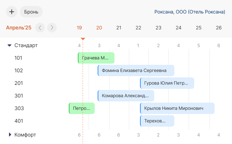 Наглядная шахматка заселений. Вся информация по бронированию отображается в удобной сетке — достаточно навести курсор, чтобы увидеть детали по гостю и номеру.