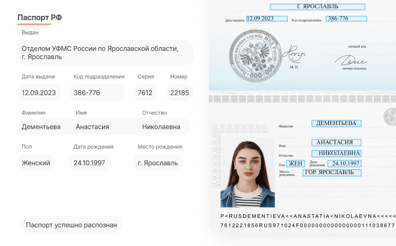 Автоматическое заполнение данных. Просто загрузите фотографию паспорта — система сама распознает и внесёт нужную информацию.