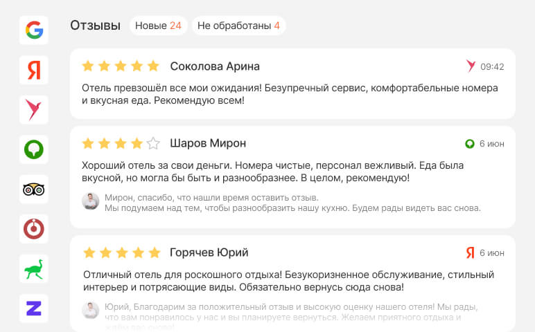 Интеллектуальная работа с отзывами. Нейросеть SabyGPT помогает оперативно и корректно отвечать на отзывы гостей с разных платформ.