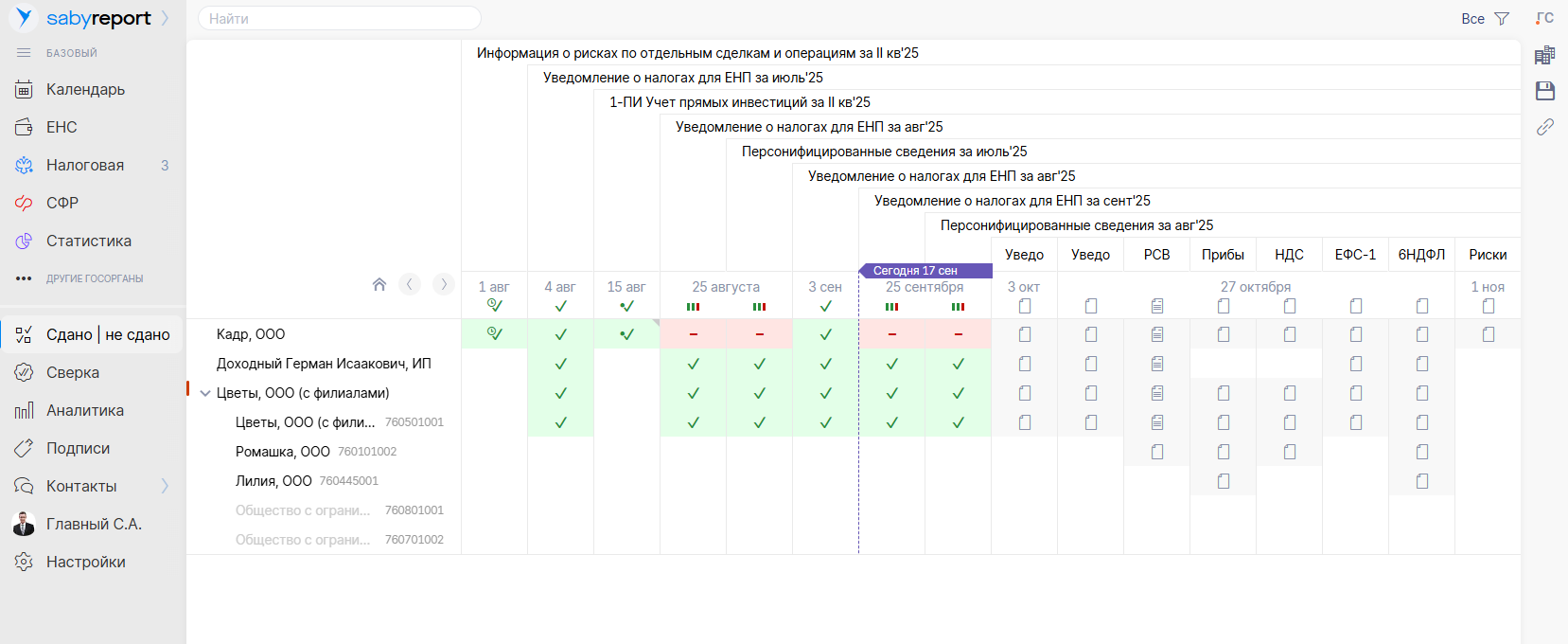 - Сверка с ФНС по ЕНС. Отображение остатков, начислений и списаний в реальном времени — по каждому налогу.