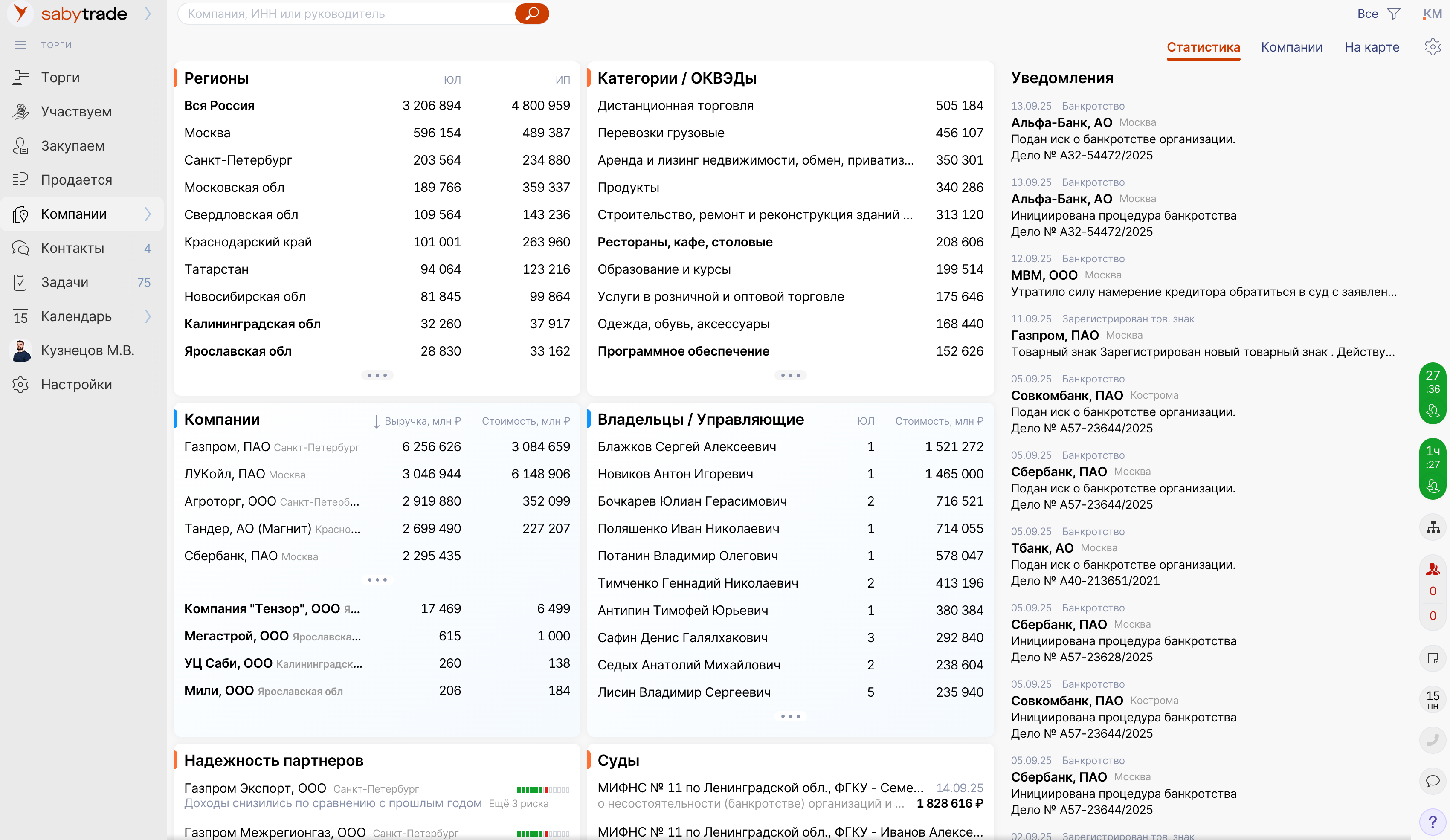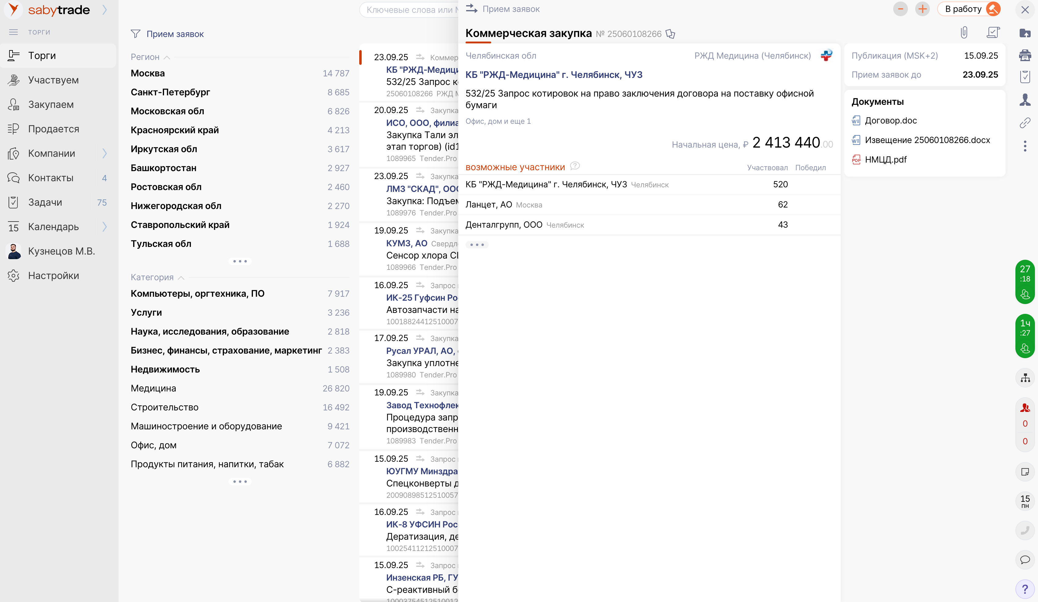 от 15000 RUBSaby Trade — сервис для поиска тендеров и закупок с единой выдачей по 700+ площадкам. Гибкий поиск вплоть до сканов документов, моментальные уведомления (в т. ч. по малым закупкам), аналитика участников и оценка шансов на победу, проверка надёжности заказчика. Тендерная CRM с ролями и правами помогает команде доводить лоты до контракта; есть API и интеграции с 1С/CRM.