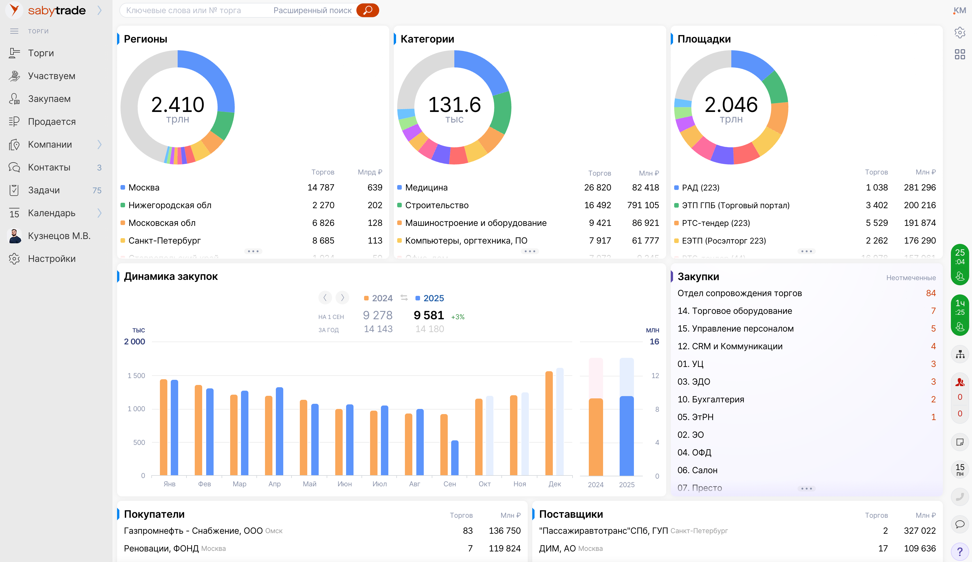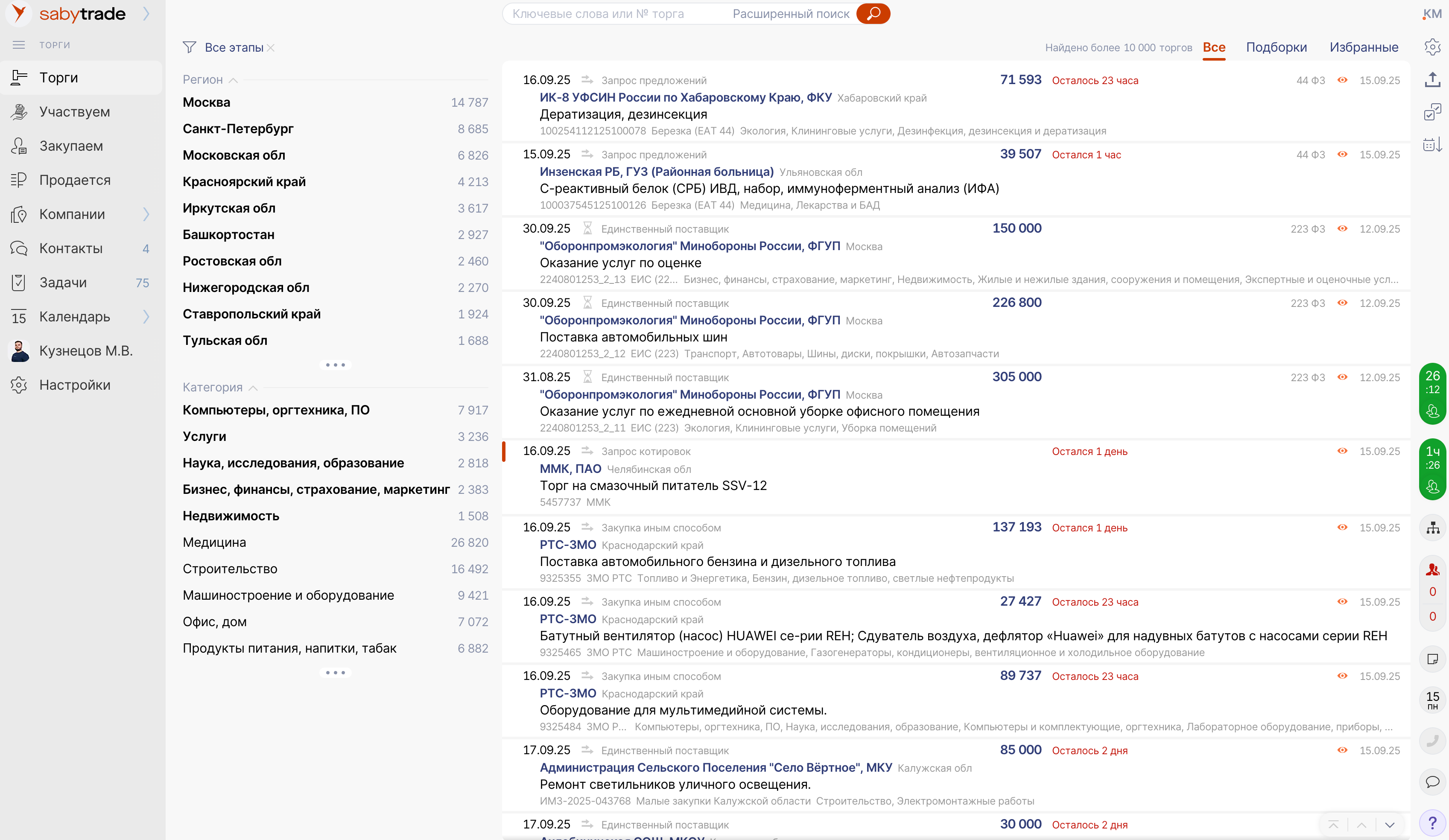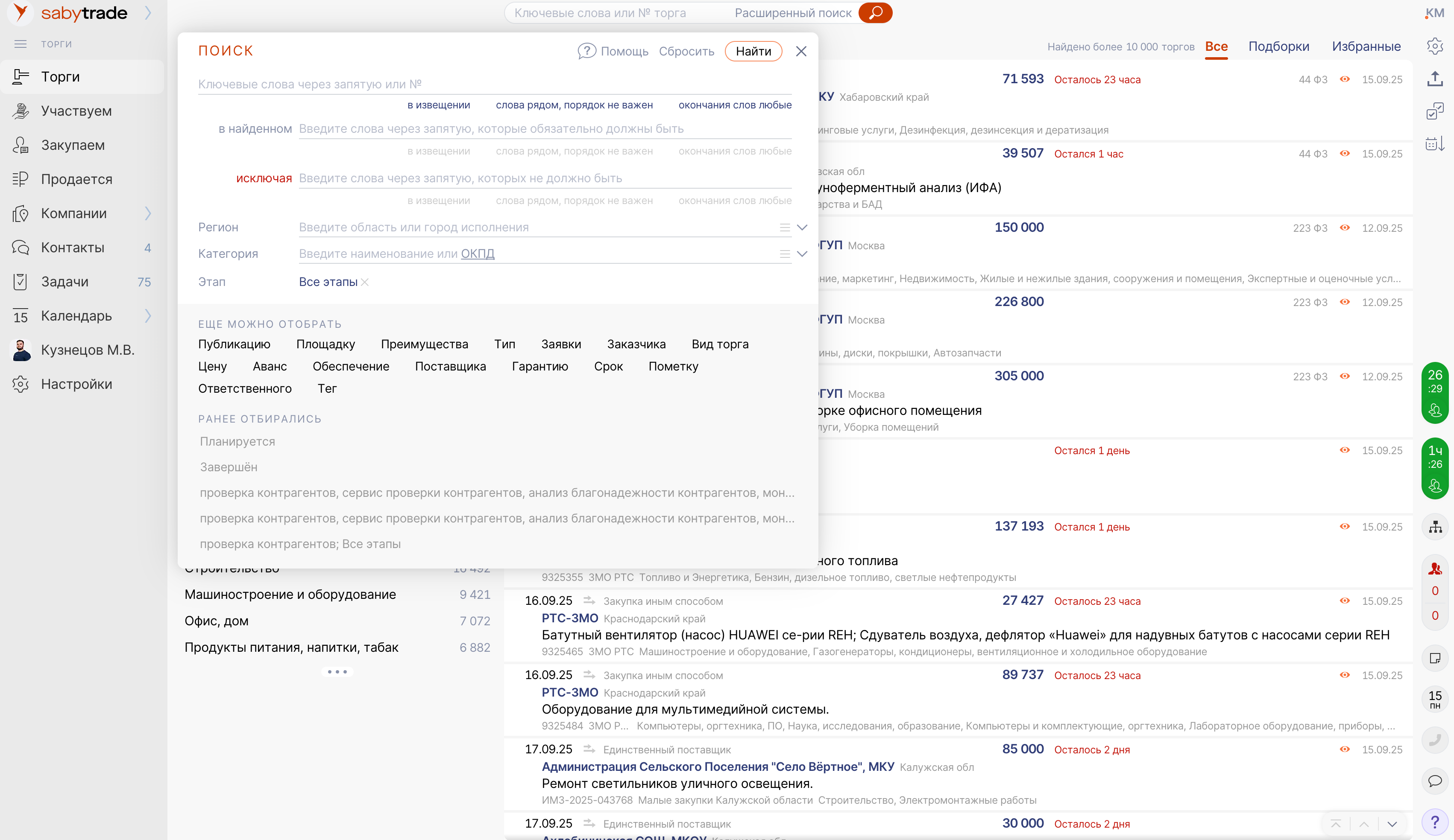 Saby Trade — единая платформа для поиска и мониторинга торгов и закупок всех видов на 700+ электронных площадках. Актуальные данные, аналитика тендеров, оценка шансов на победу и инструменты командной работы — всё для стабильной работы тендерного отдела в одном окне.
